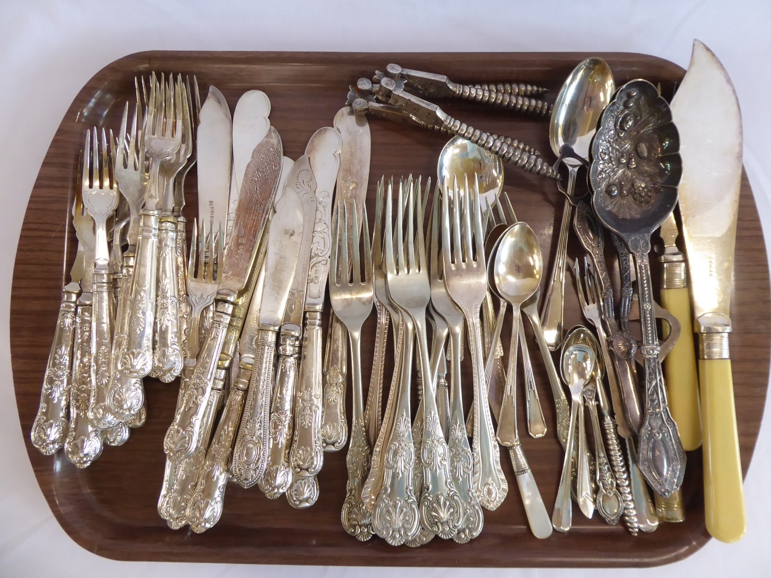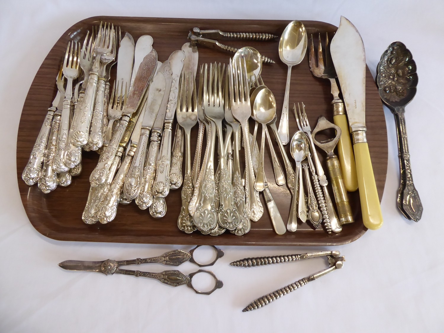 Silver plated Kings pattern cutlery, grape scissors, berry spoons etc