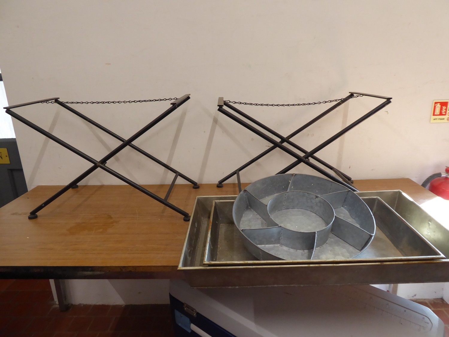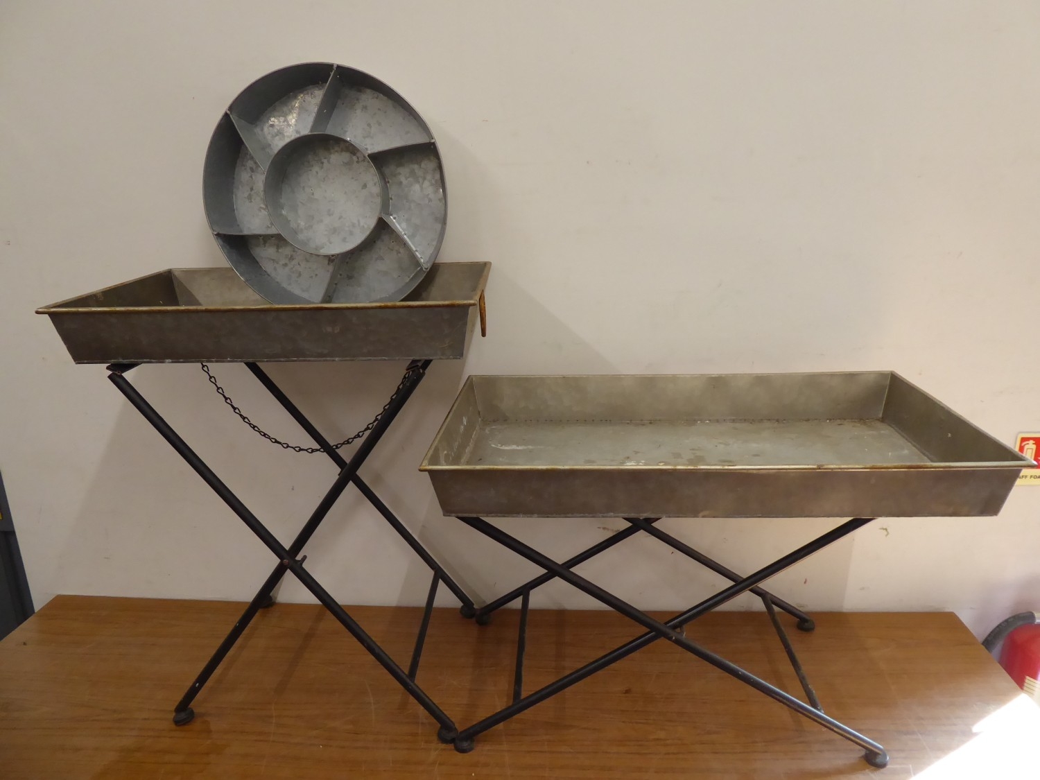 Zinc garden butlers trays on folding metal stands (2) and ci...