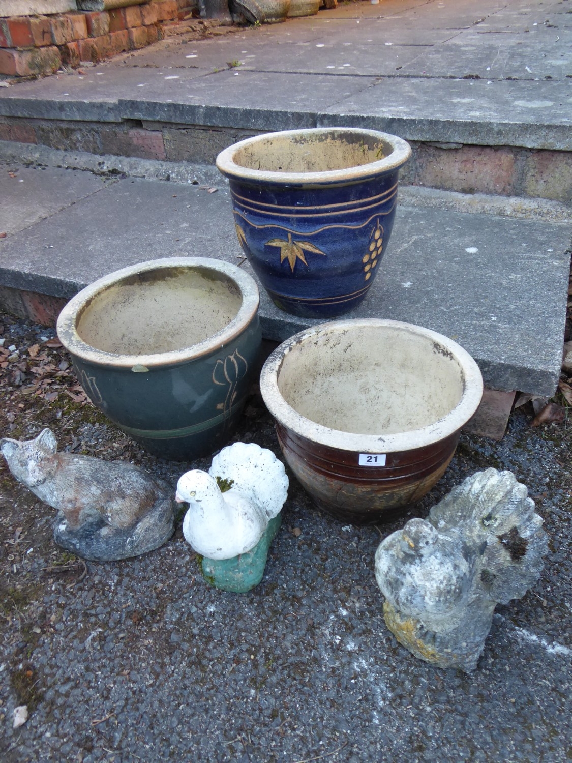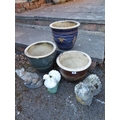 Glazed planters and concrete animal and dove figures (6)