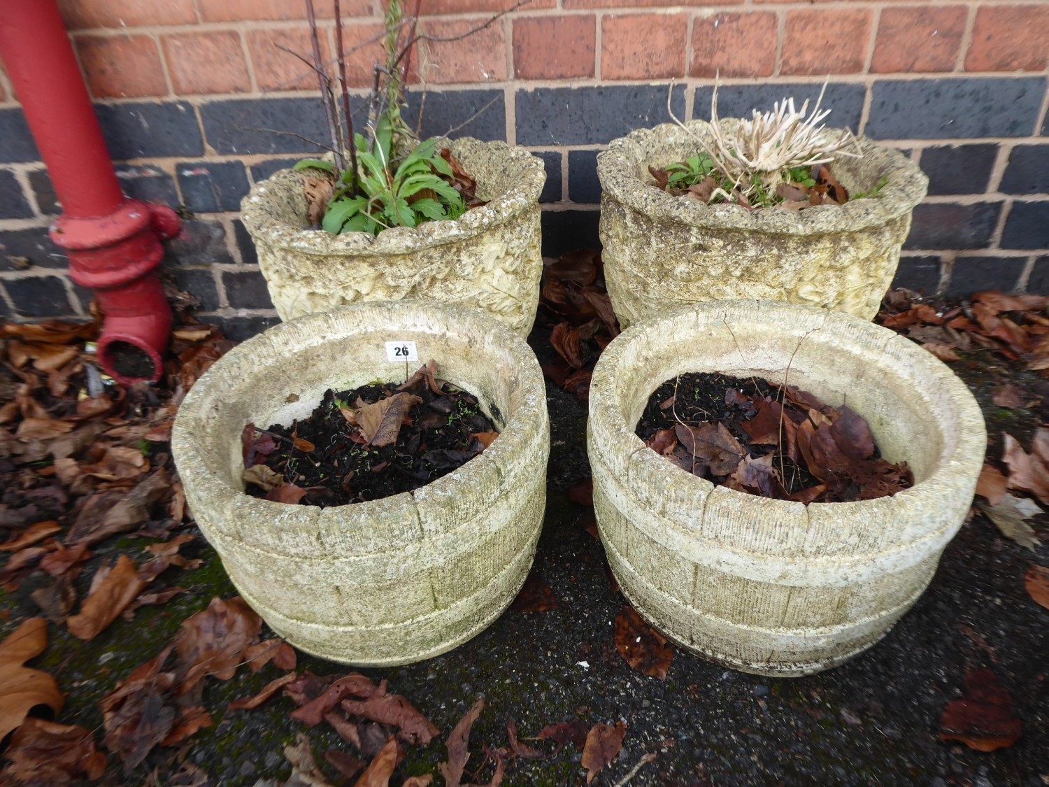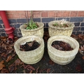 Pair of concrete oak leaf design and pair of barrel design garden planters